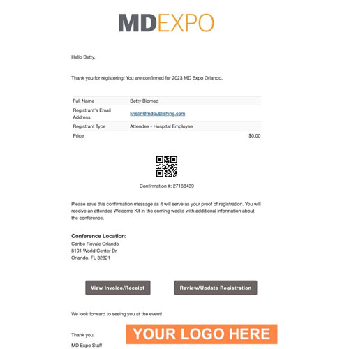After attendees register for the conference, they will receive an auto-generated confirmation email, and your company can have exclusive placement with an outbound link to your website to learn more about your products and services.